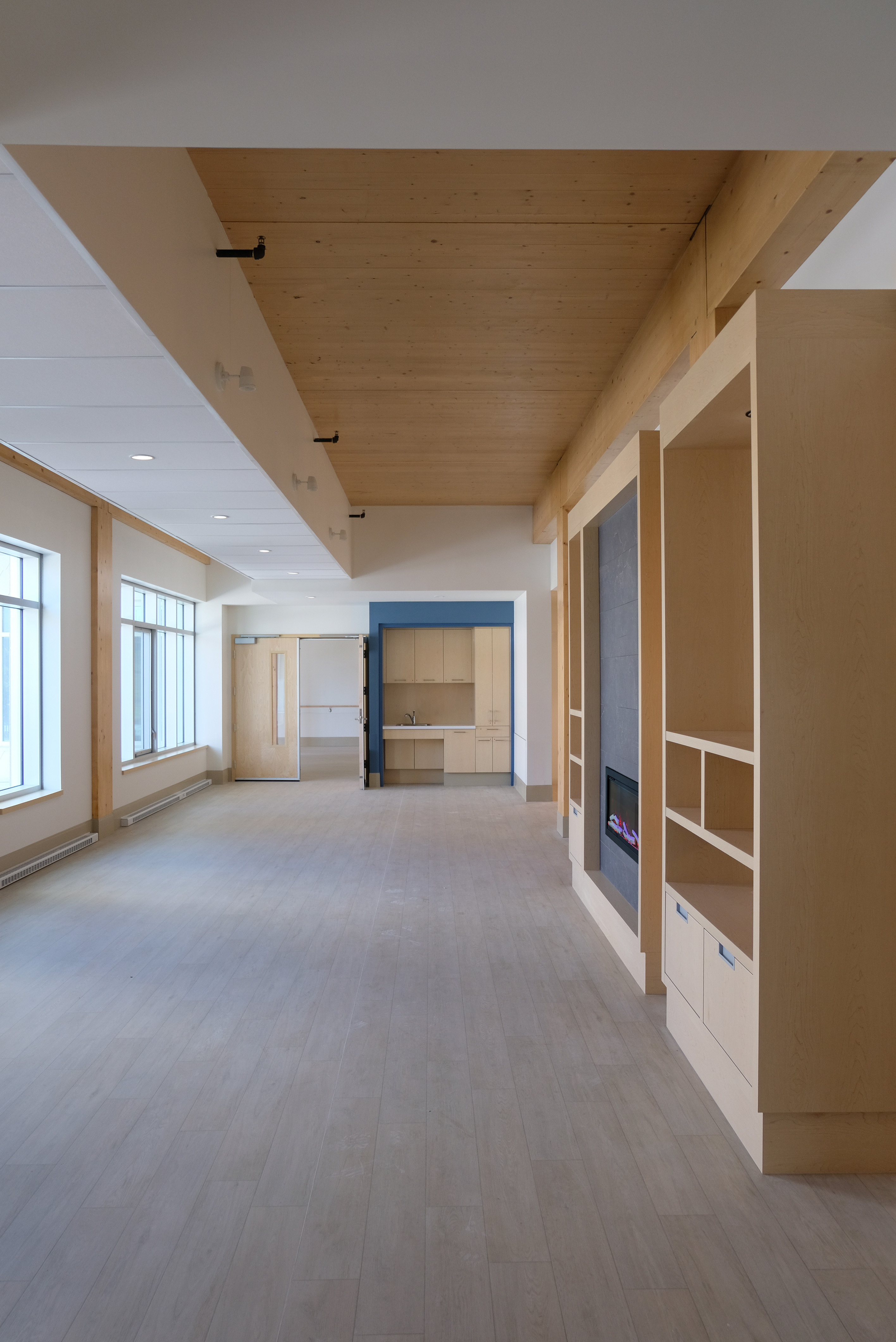 La maison des aînés et alternative de Saint-Hilarion offre 48 chambres individuelles avec salle de bain adaptée, dont 36 sont destinées aux personnes aînées et 12 sont réservées aux adultes ayant des besoins particuliers. Ce projet, géré par la SQI, se distingue par l’utilisation prédominante du bois dans sa structure, une approche qui vise à créer une ambiance accueillante et un environnement chaleureux pour les résidents. Les travaux de construction ont débuté au printemps 2022 et les premiers résidents ont été accueillis à l’hiver 2025.